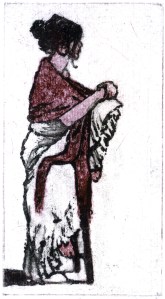Almost right away, I knew I wanted to create an etching and call it “The Rose Shawl.” This is ink lift and aquatint on a copper plate approximately 2.5×5 inches. After applying the black ink, I rubbed in a bit of red for both the shawl and skin tone, then printed on white Murillo.