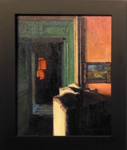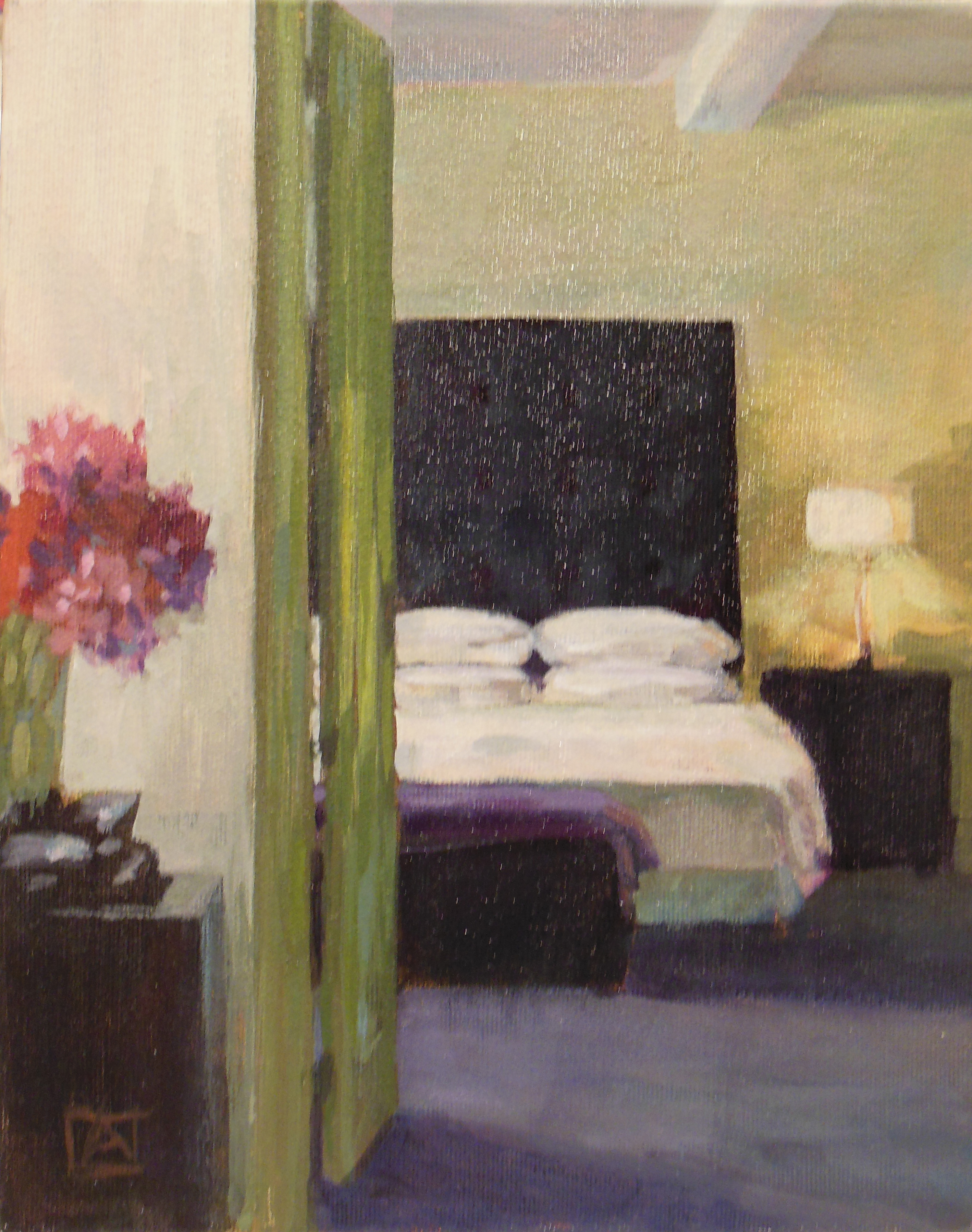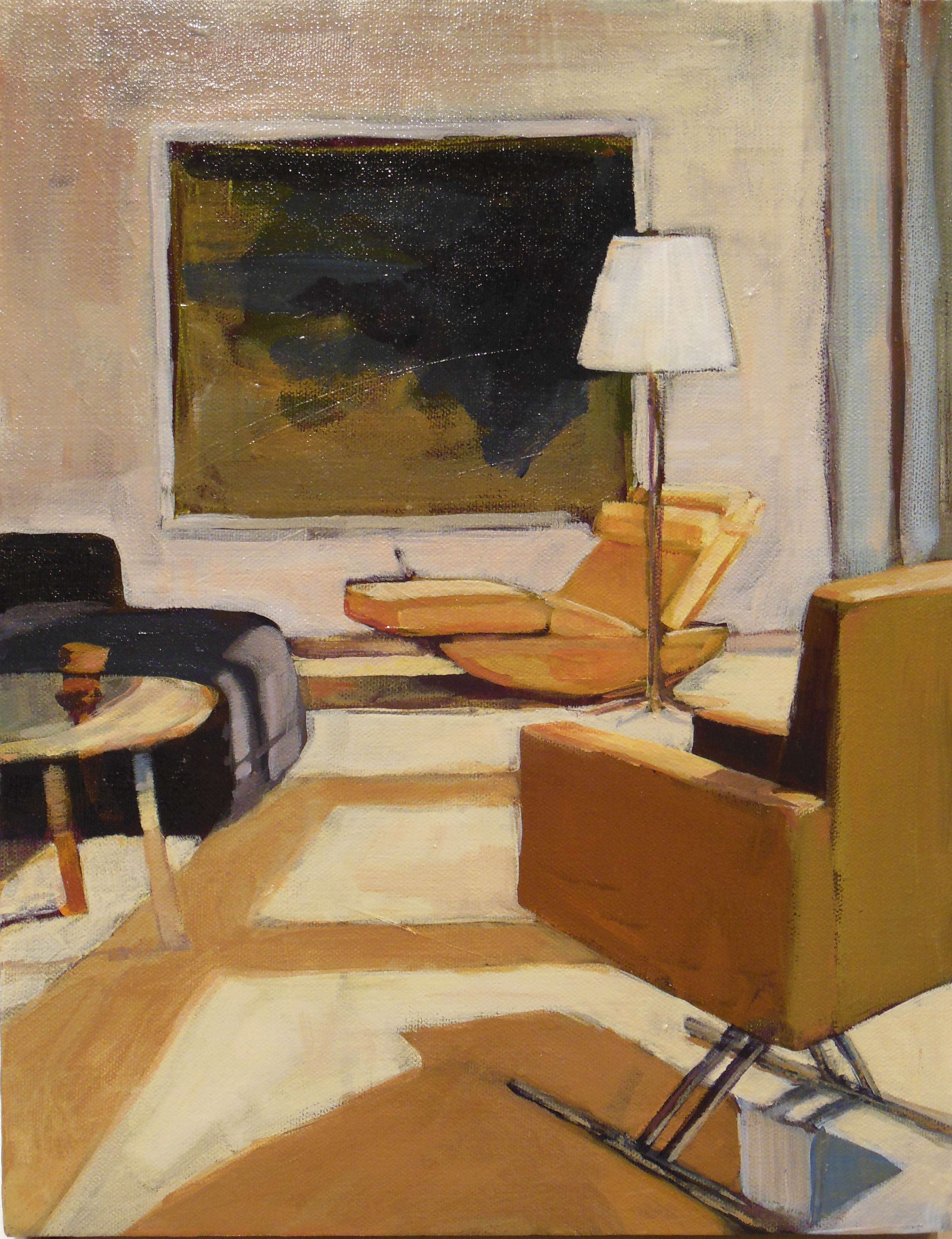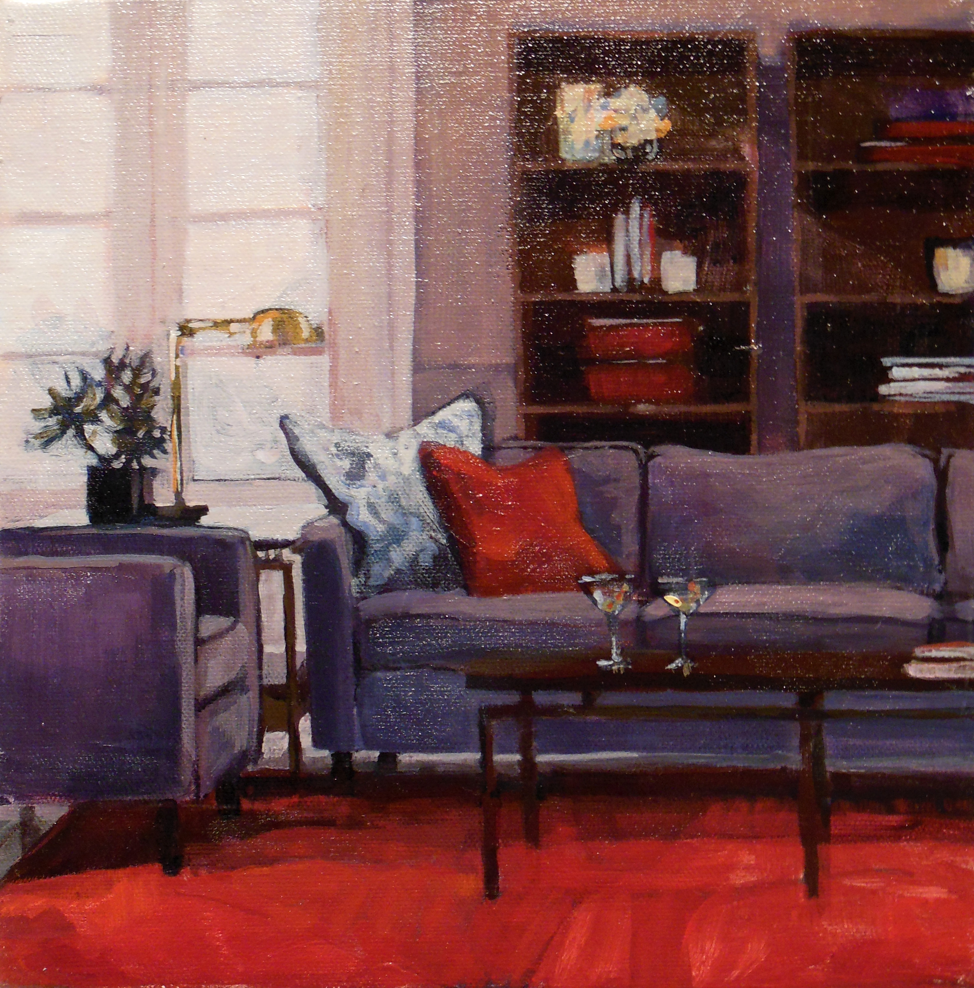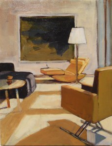 On the left is the photo from The Sunday New York Times. On the right is my painting (11×14). Believe me, it started really loosely–just large shapes. I was pleased with some bits right away and knew not to touch them again–like the end table on the left and the painting on the back wall.